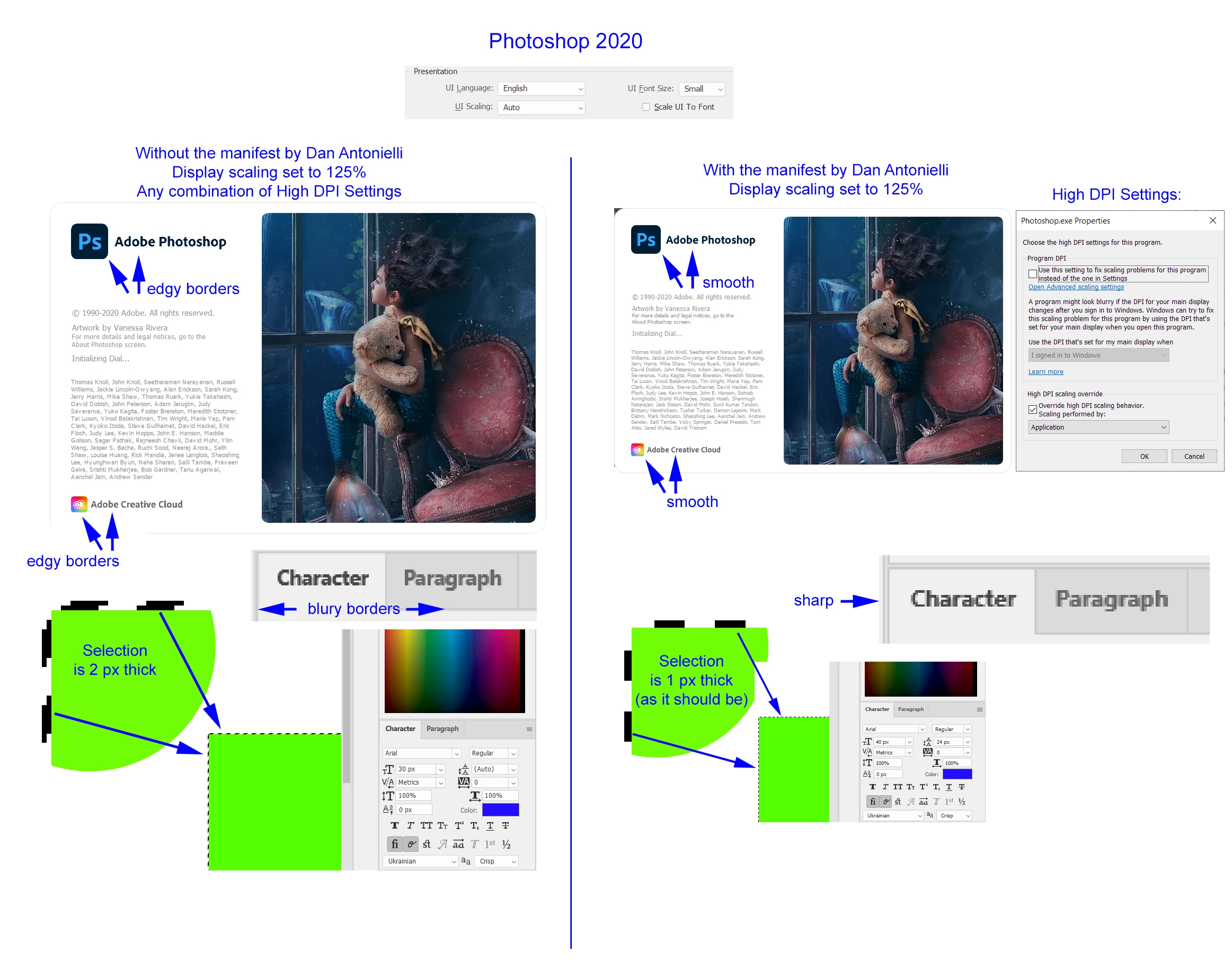 Because without the Manifest file, at 125% Windows Scaling, Photoshop UI is so big that it is very difficult to have any workspace.