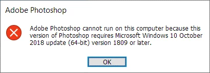 Adobe Photoshop cannot run on this computer because this version of Photoshop requires Microsoft Windows 10 October 2018 Update (64-bit) version 1809 or later.