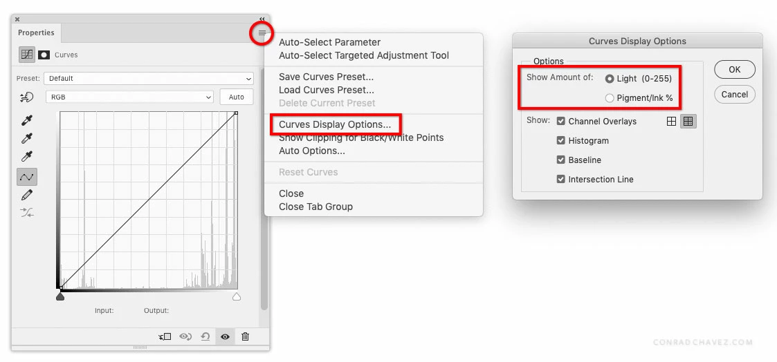 If you’re looking at the Properties panel for a Curves adjustment layer, you can use the Curves Display Options dialog box to reverse the direction of the histogram. In the “Show Amount Of” option, choose Light (0-255) or Pigment/Ink%.