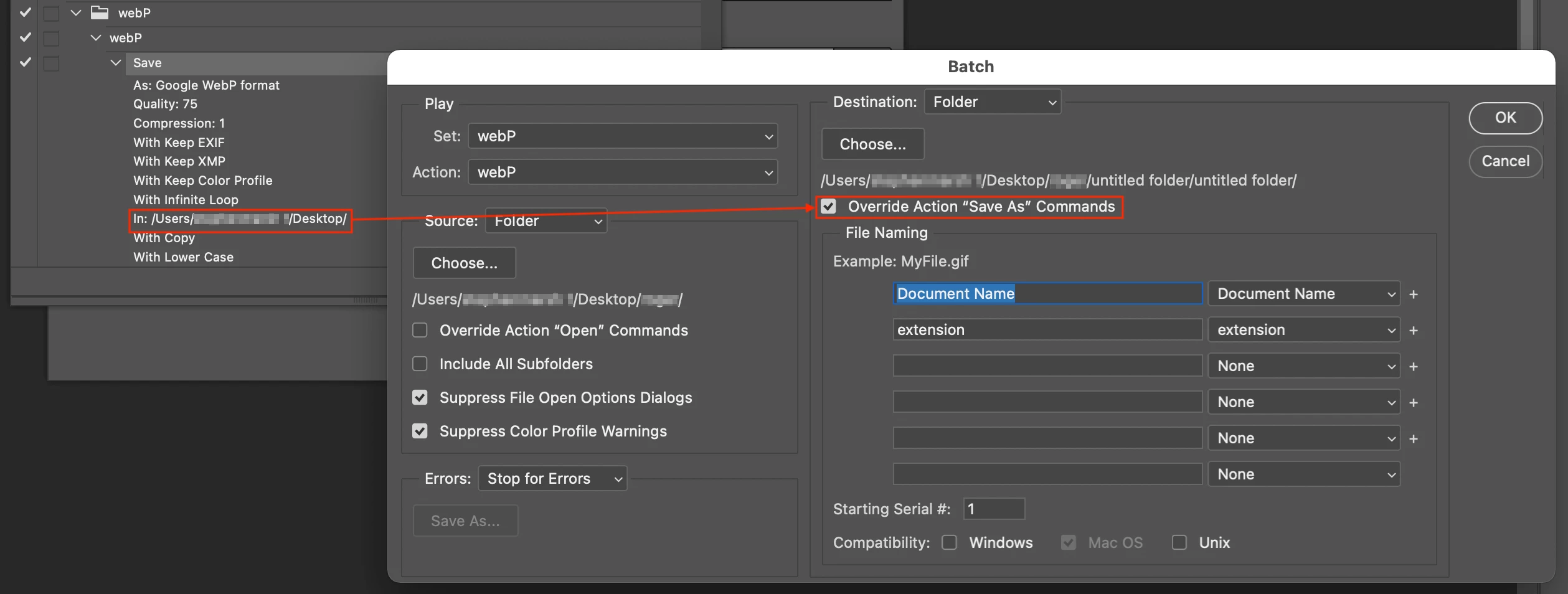 I want to create an action where it opens a JPEG file, saves as a WEBP and then closes. I have multple files to save as WEBP's. I have tried to do this action before and it worked... but only for one file. It doesnt work in Batch.