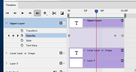 4. Drop down the menu for the top layer and click on the clock. Move the cursor and add keyframes whilst changing the opacity in the layers panel. The keyframes mark the end points - Photoshop will fill in the in between values So I set 3 keyframes - the first at 0% opacity and the second and third at 100%
