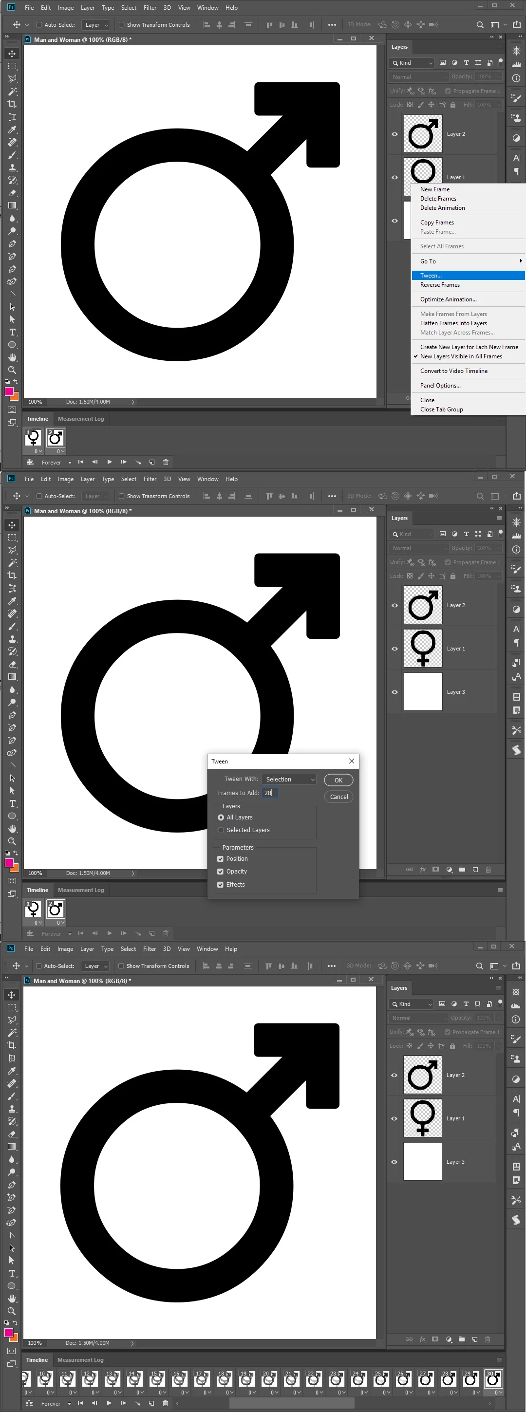My old way of making a simple GIF that fades into each frame was to make the first frame like a normal photo, and the next frame with the 1st image at 90% opacity and the 2nd image at 10%, then the next frame be 80% on the 1st and 20% on the 2nd and keep going until I have a frame for each (30 frames or more). Then I would put them together as a GIF by File > Scripts > Load files into stack.
