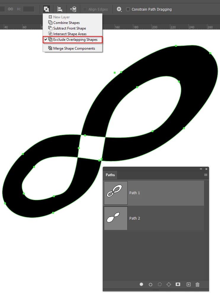 To get the shape below I started the upermost outline and dragged to the New Path icon to save it.