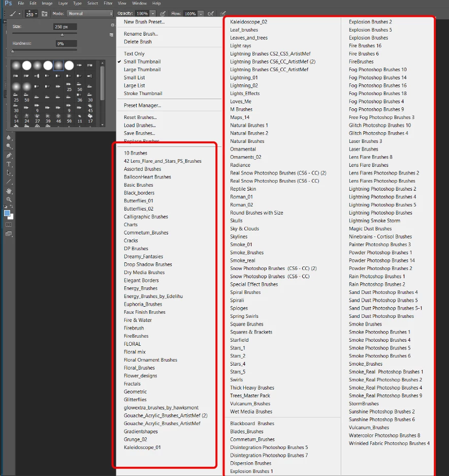 How can I organise/re-arrange the list of brushes PS CS6?