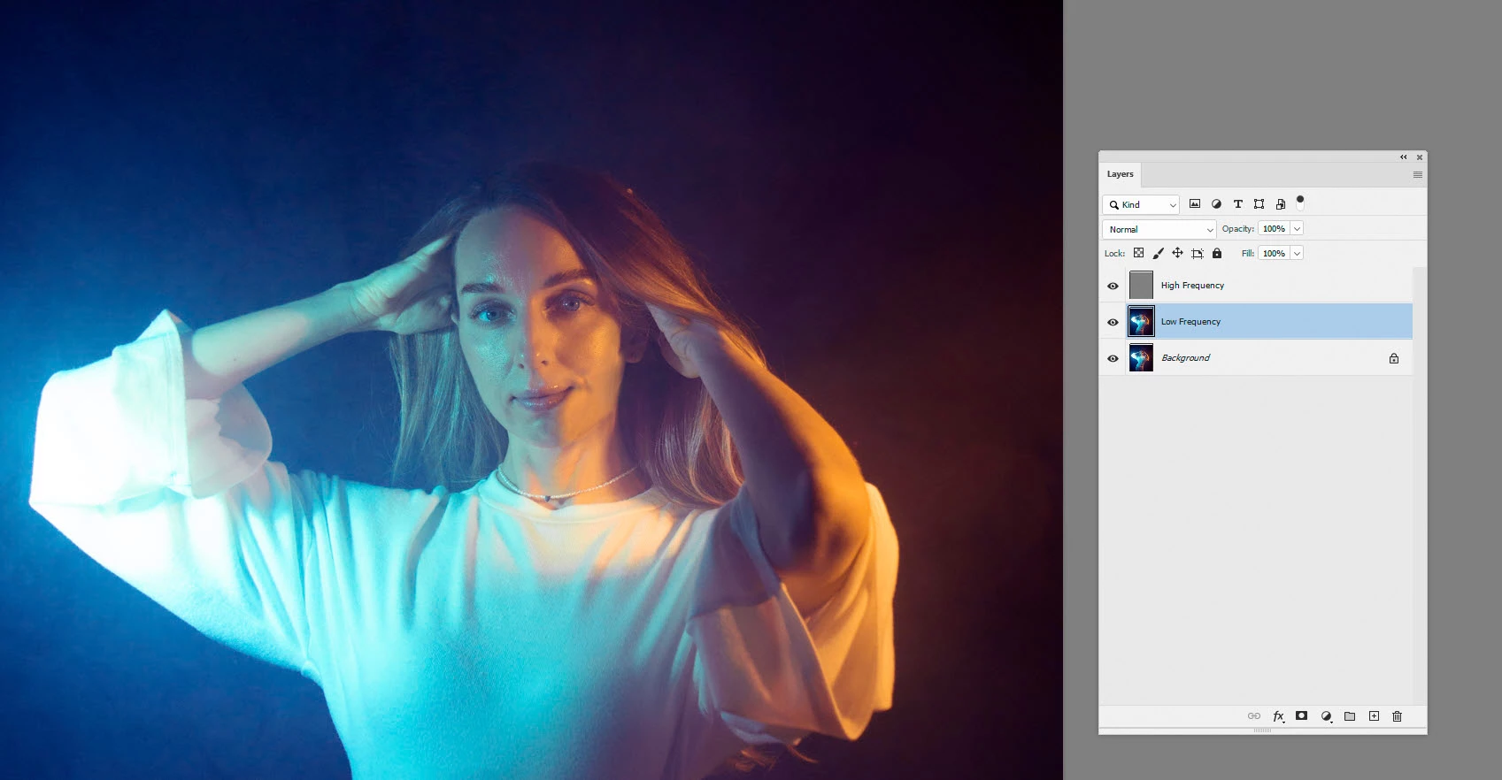 5. Now you can retouch each separately. I brushed colour onto the low frequency layer and then cloned out the shadow edge on the high frequency layer.