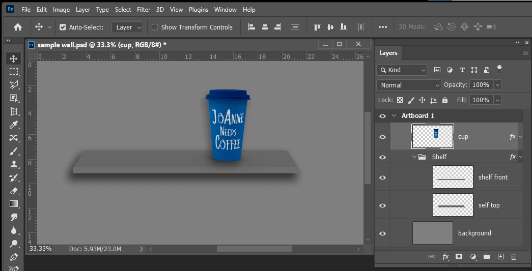 I'm working with a kit to create a close mockup of a wall/desk scene. Since nothing had all the objects I needed, I'm having to add outside objects to the shelves, such as the coffee cup pictured. Since the perspective/camera angle is wrong, I need to tilt the object back so it'll sit realistically on the shelf. Since several other outside objects will also need to sit on shelves, I gotta figure this out. Although I'm not new to Photoshop, I haven't really delved into the 3d portions until now, and I'm suddenly feeling like a beginner. I've spent pretty much all yesterday afternoon and evening researching, watching videos, and trying everything I can find...and failed each time.