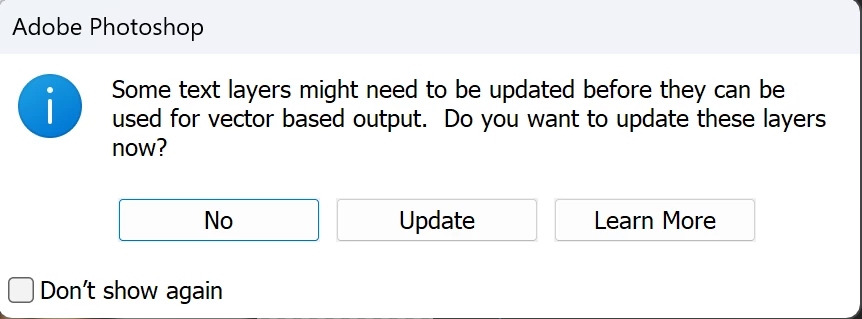 Problem is, a while back I clicked on "No" then checked "Don't show again", and now I can't make that message to show up again. I tried: Preferences > General > Reset All Warning Dialogs, closed PS then reopened my file, but that message still doesn't want to come up for this exact file (it does however show up for other files). I looked everywhere for a way to apply this update to my entire document but I can't find anything. How can I solve this very simple task?