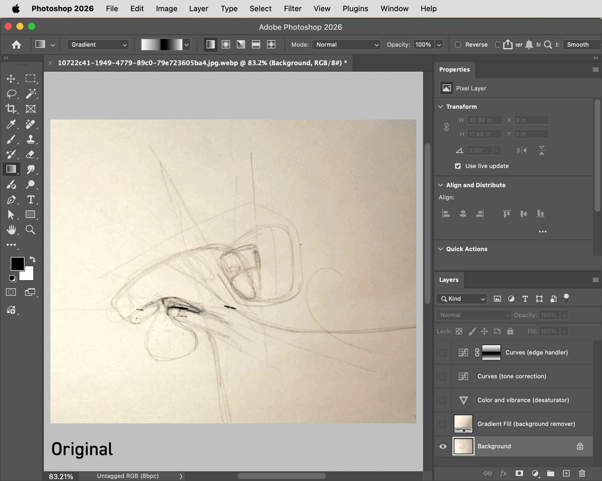 - Selecting perfectly (to capture the graphic expression) thin pale pencil lines from their uneven grey background.