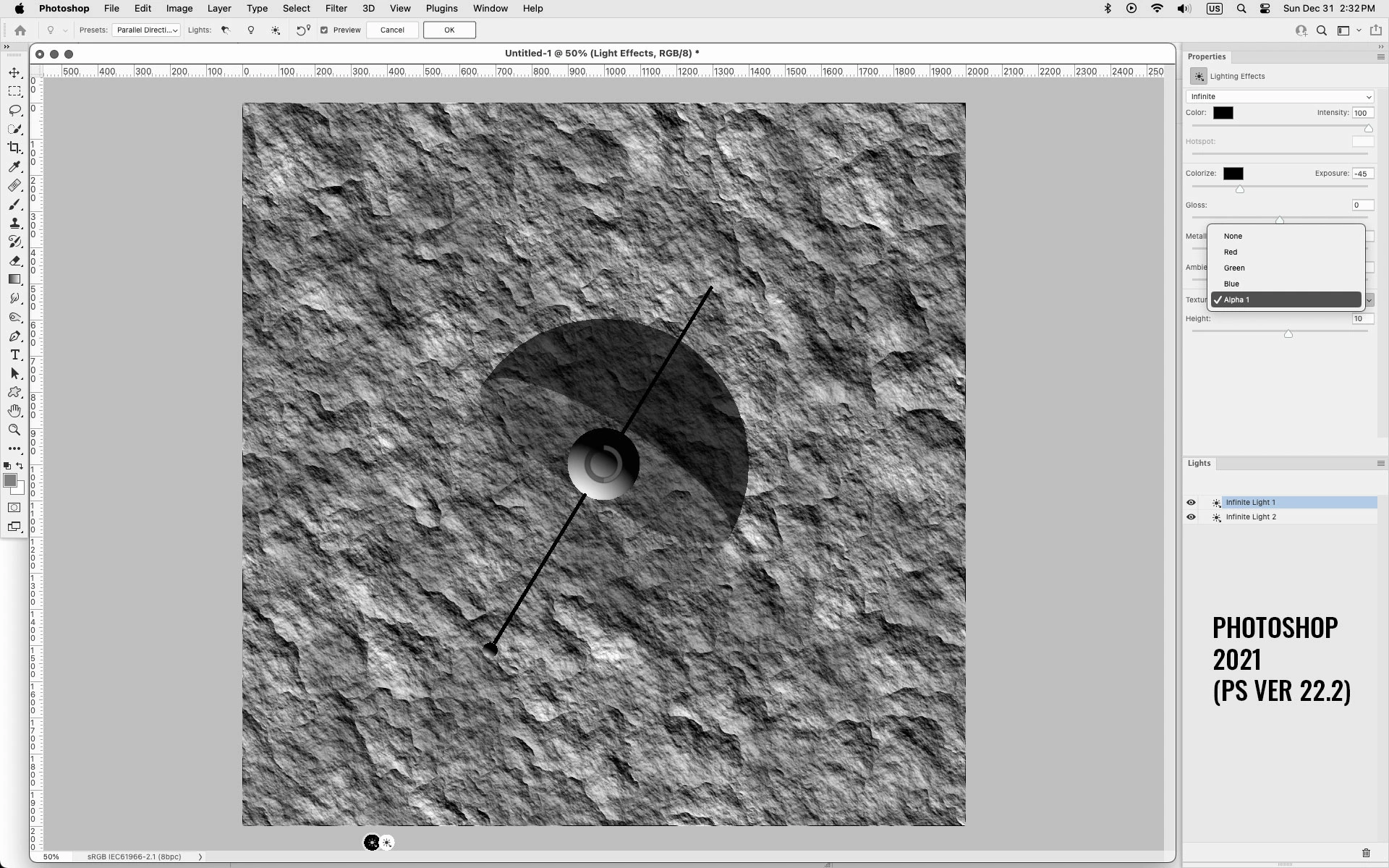 But once I try to use the Directional Lighting filter on the Alpha channel, it won't let me select it. I can select either Red, Green, or Blue channels just fine, but this won't complete the tutorial.
