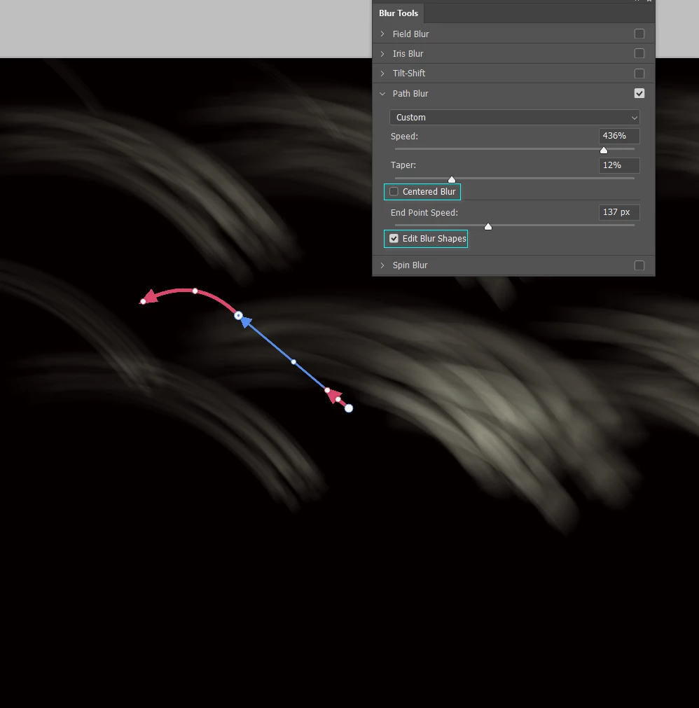 Check Edit blur shapes which will bring up the Red arrows (Not the RAF display team — you don't want them buzzing around your computer). Adjust the direction and shape of the red arrow to suite.