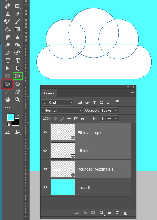 The cloud is a good place to start, and is made of three circles (red) and one rounded rectangle (green)