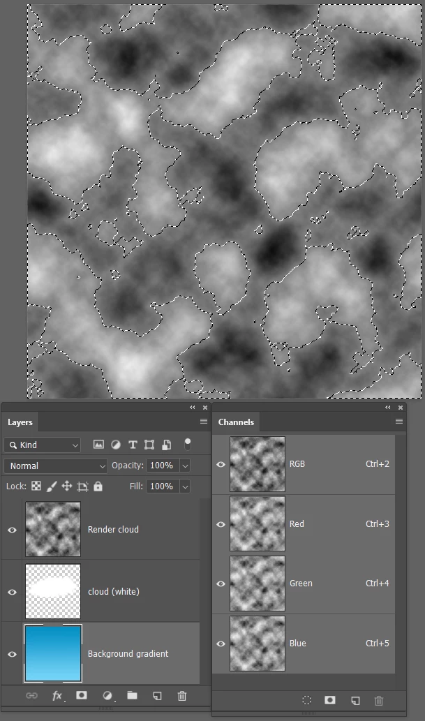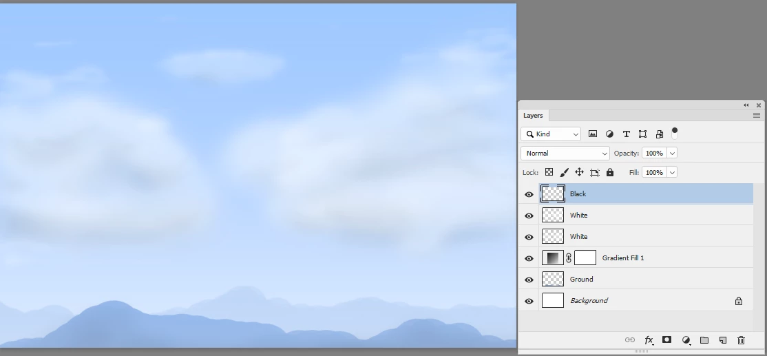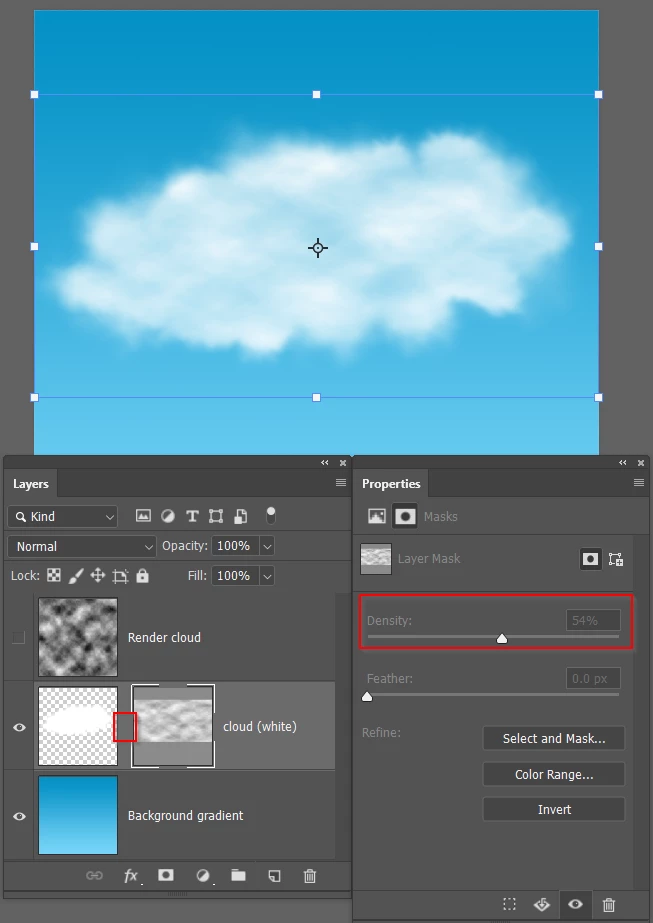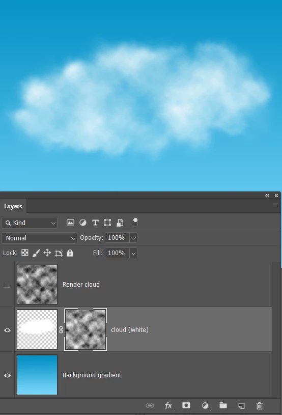 And with black as foreground colour, turn off the Render Clouds layer and add a layer mask to the cloud layer
