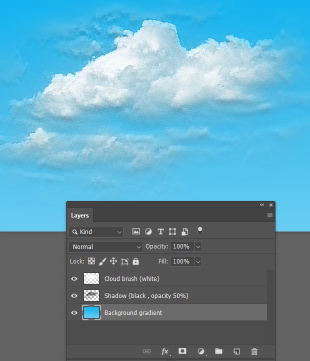 You can make a cloud brush with the clouds filter, several would be idea. Paint in a rough shape of a cloud with 100% opacity. Lock the transparency of that layer - don't do it on a background layer! Next select a darkish blue gray and fill the layer with that: