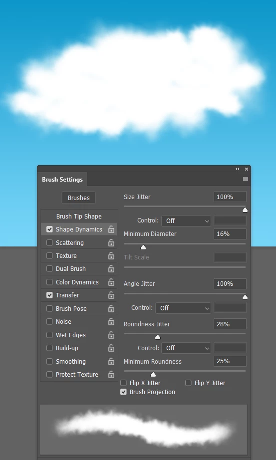 Then with your variety of cloud brushes select white and a medium to low opacity and paint in the highlights of the cloud. since you locked the transparency, it's easy to go around the edge to add a nice highlight without bleeding into the BG: