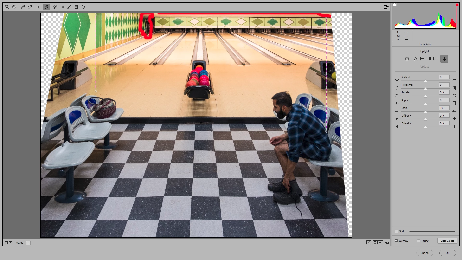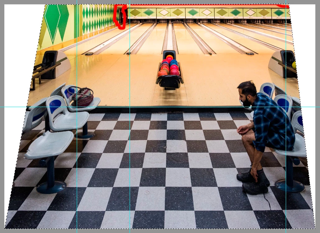 The vertical line on the left with the red circle should be perpendicular to the horizontal plane beneath it, but instead it's leaning left, which is unnatural. I've tried making it vertical with the different perspective tools but that always results in radically changing the dimensions of the image. How would you guys tackle this?