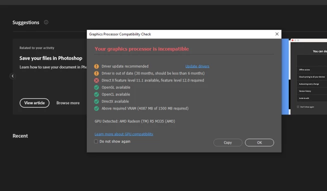 In short your GPU does not meet the requirements to run all the features in the current version of Photoshop which requires Direct X feature level 12 .