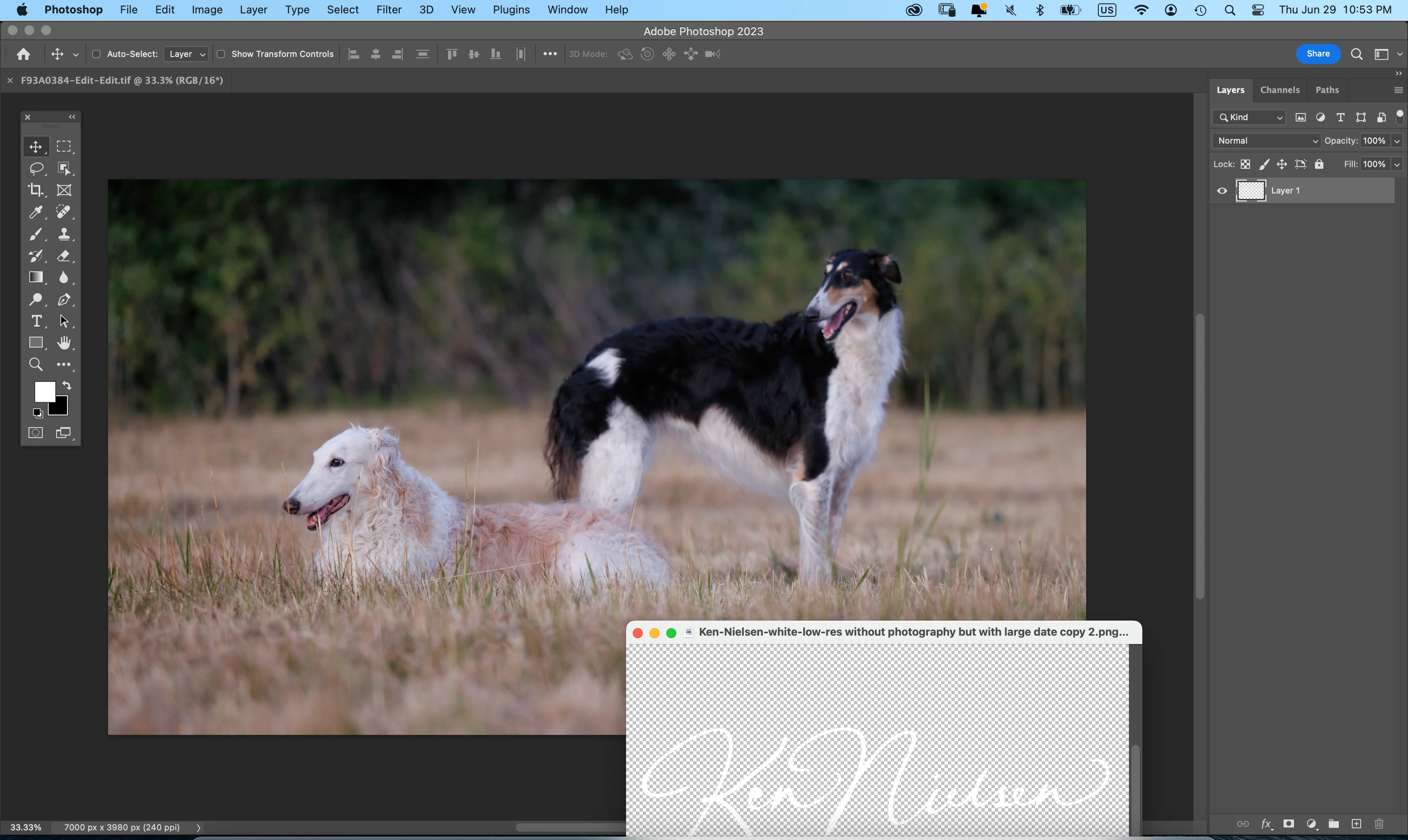 Here is the workspace with a photo in place but only after I 'unglued' it from the already open image you see with my signature and then placed it where I wanted it to be 'full screen' so I could work on it.  I also show my choices are default for the workspace as I am working to reconstruct everything back to the way I had set it up for years until needing to re-install Photoshop, all of that has to be re done and your help is another piece of the puzzle that will go into place.