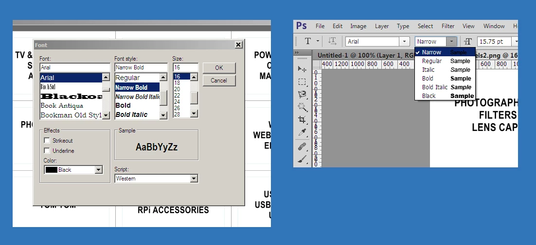 The attached pic shows two screenshot sections. The left-hand one shows a standard font-picking dialog box from a program I wrote (using Visual Studio) to make up sheets of labels. The right-hand one shows the font-picking menu from PS CS6.  As you can see, I can use (for instance) Arial Narrow Bold in my own application, but that particular font style doesn't seem to be available in Photoshop.