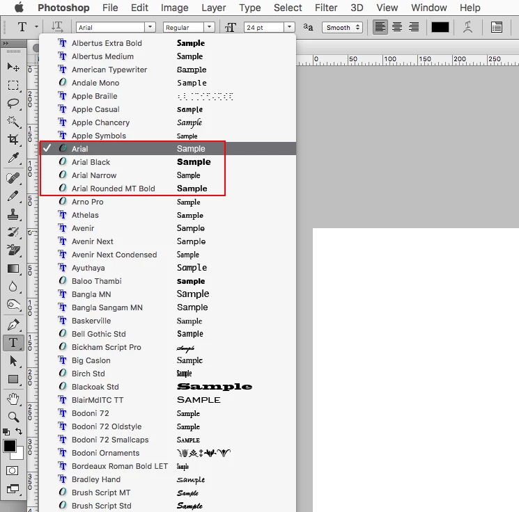 If you click on the Font Family drop-down list, you don't see other Arial fonts shown like below:
