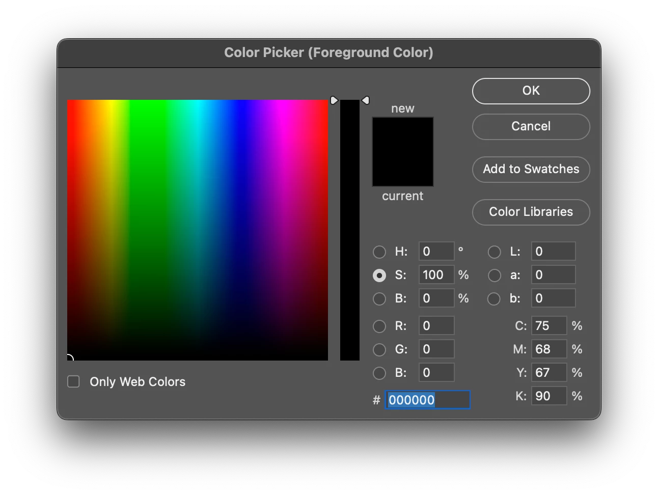 The color picker has completely changed from what it was. It’s now bands of color rather than a gradiant of color in the middle square with color range on the bar on the right. Here is what I see in PS 2026: