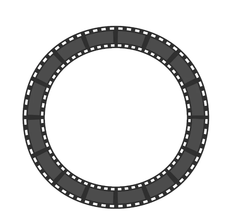 Because there are still some challenges getting this done in Photoshop without distorting it in an unwanted way, below is a demo of why you might want to do this in Illustrator instead. If a film frame is set up as a Pattern brush, it distorts to fit the circle, and its overall proportions are maintained as you adjust the thickness using the Stroke value alone. No math required.