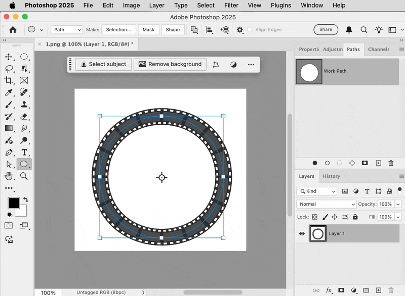 1. With the Ellipse tool in Path mode, draw an ellipse that tracks the center of the current filmstrip ring. You can also use the Elliptical Marquee tool, but I think paths are easier to adjust precisely.