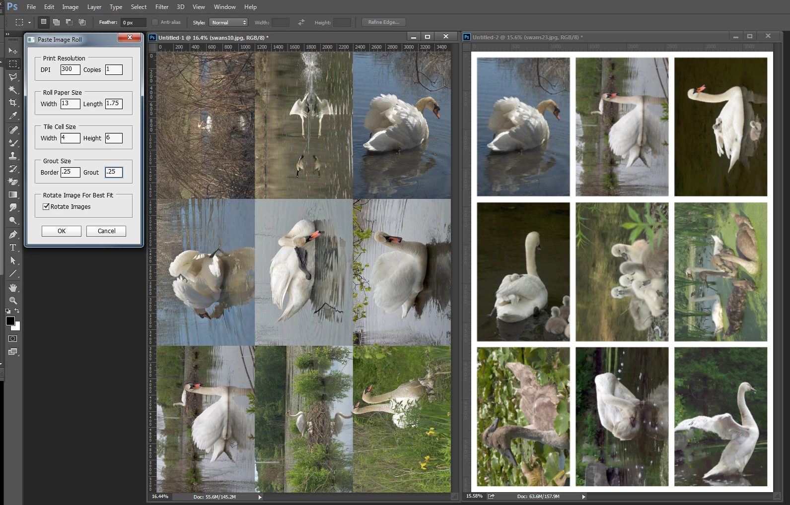 Though I wrote the PasteImageRoll script for printing a large number of images on roll paper. There is no reason it can not be used for cut paper. Image do not need to be size sized or rotated. The script will handle that. Scripting is much more powerful them Actions. The script will calculate the number or of columns of image that will fit on the width of paper you set and will not run if the number of image you select will not fit the length of paper you set is left on the roll of paper. So if you have 13" x 19" cut paper it like 19" left on your 100 foot 13'' wide roll paper. So if set 300 DPI, 1 copy of pictures 13" wide Paper , 1.75 feet left, 4" wide 6" high, .25" border .25" grout and rotate for best fit. You can select any 9 image in a folder and the will size the fit the 4"x6" tiles. If the image do not have a portrait or landscape 3:2 aspect ratio the sized images will be centered virtual crops. The image are not cropped they are masked. You can manually tweak the crop by moving the image before printing. If you omit the borders and grout the document create will be 12"x18" with the 13"x19" http://www.mouseprints.net/old/dpr/PasteImageRoll.jsx