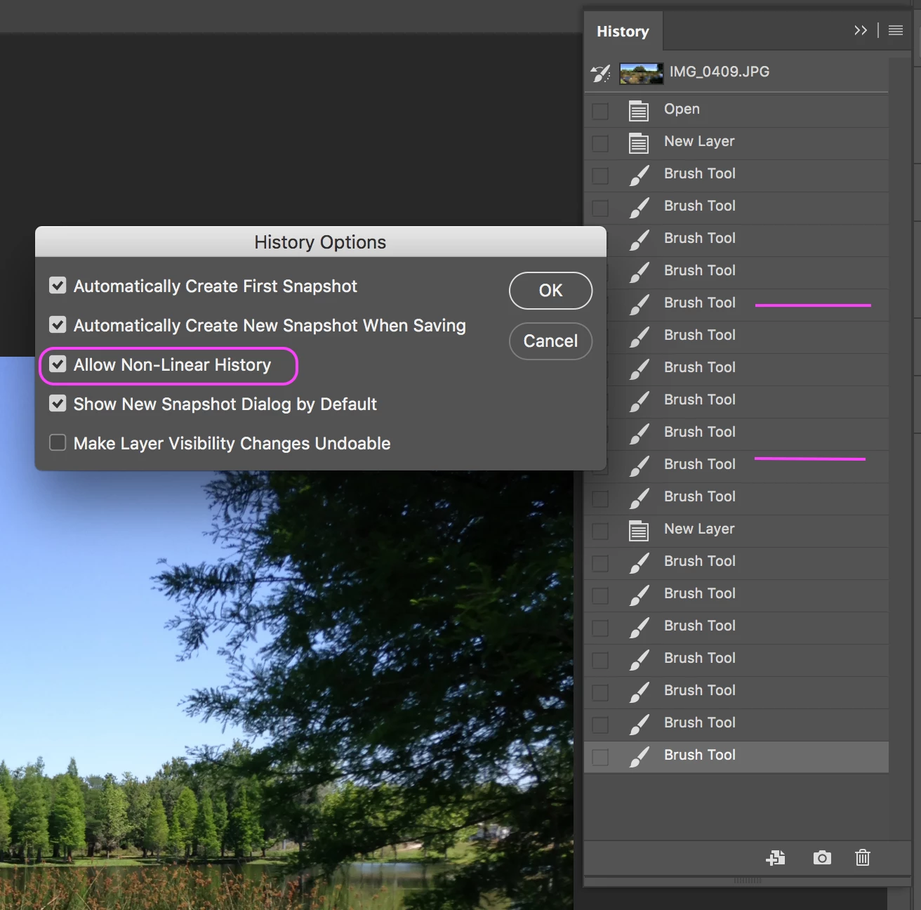 I am using photoshop cc 20.0.0. I want to select an entire set of history snapshots and delete them. I can currently only delete one snapshot at a time starting at the bottom.