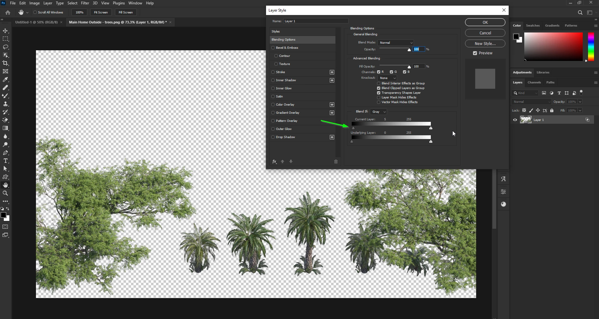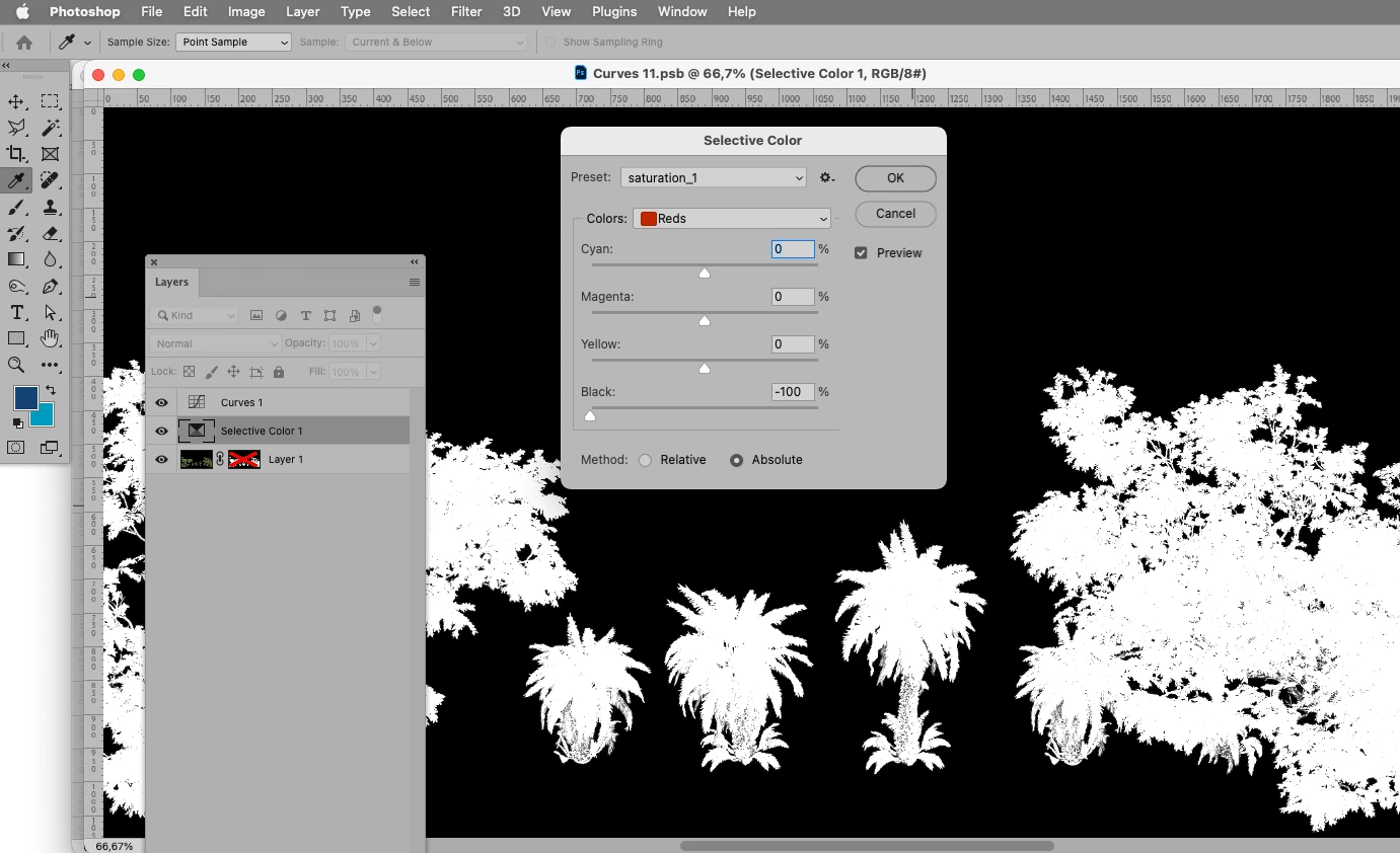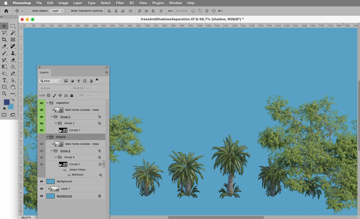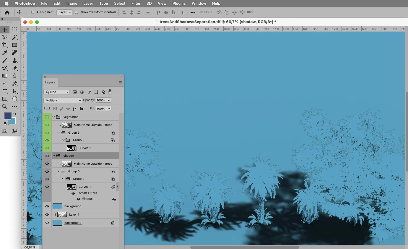 I would like to separate the trees from their shadows and have them on separate layers.