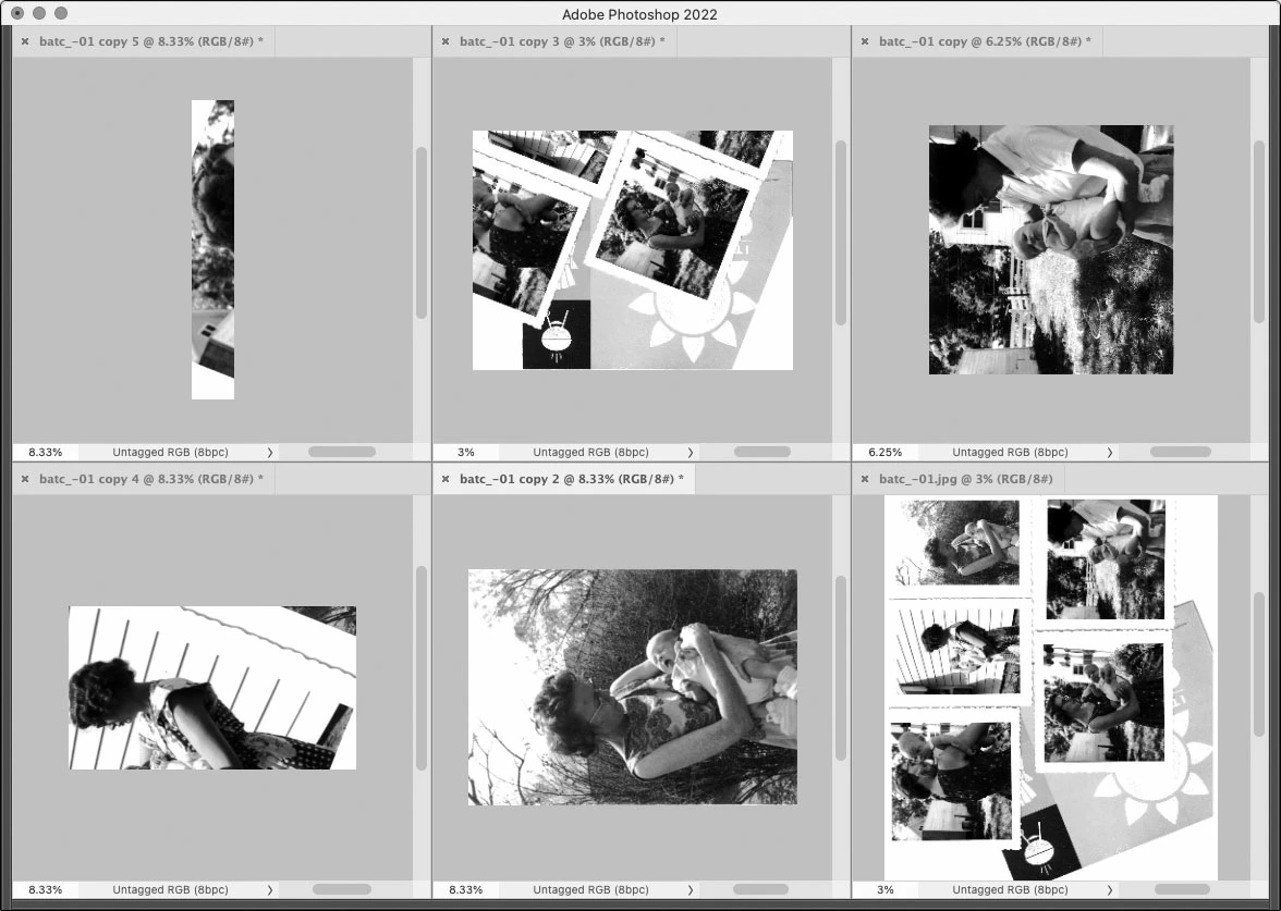 To streamline a process of preserving and digitizing a collections of old family snapshots, I would load up as many as I could fit on the pane of a flatbed scanner and scan them all into one high-res jpeg. Example below. I did it this way becauase I remember a capability in Photoshop Elements more than a decade ago that could identify that multiple images were present and create separate jpegs for each component image. Is there such a capability in Photoshop?