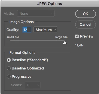 Hello, I have a rather unusual question. How not to compress the image, when using jpeg (jpg) format? For example: there is an image with the resolution of 6000x40000 300DPI, in Photoshop size 68.7 MB, with compression 13.1 MB. Is it possible to not compress the whole image in Photoshop? If not, is it possible to decode the jpeg format to increase the image size? Or native to raise the size of the image?