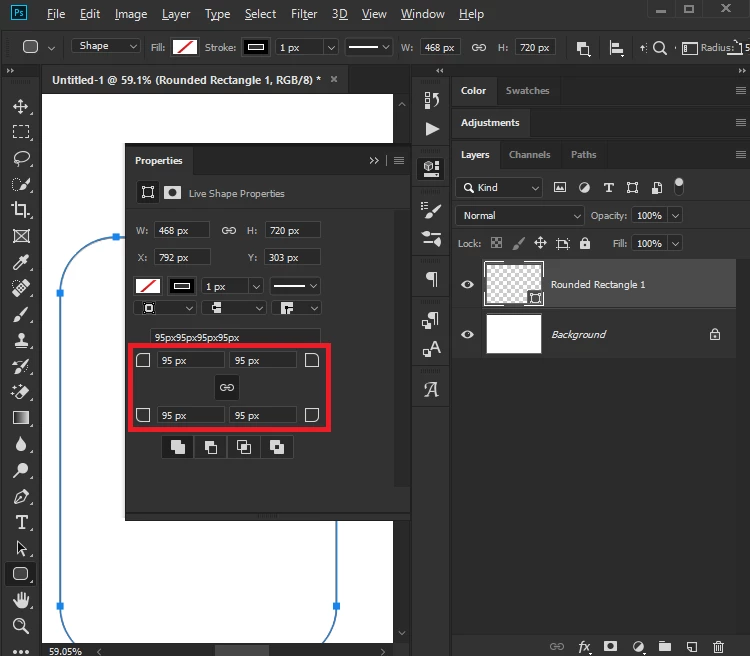 You can use CTRL/Cmd  + T command (Free Transform) to adjust size of shape and corners. You can use som transform options to fit your destination size