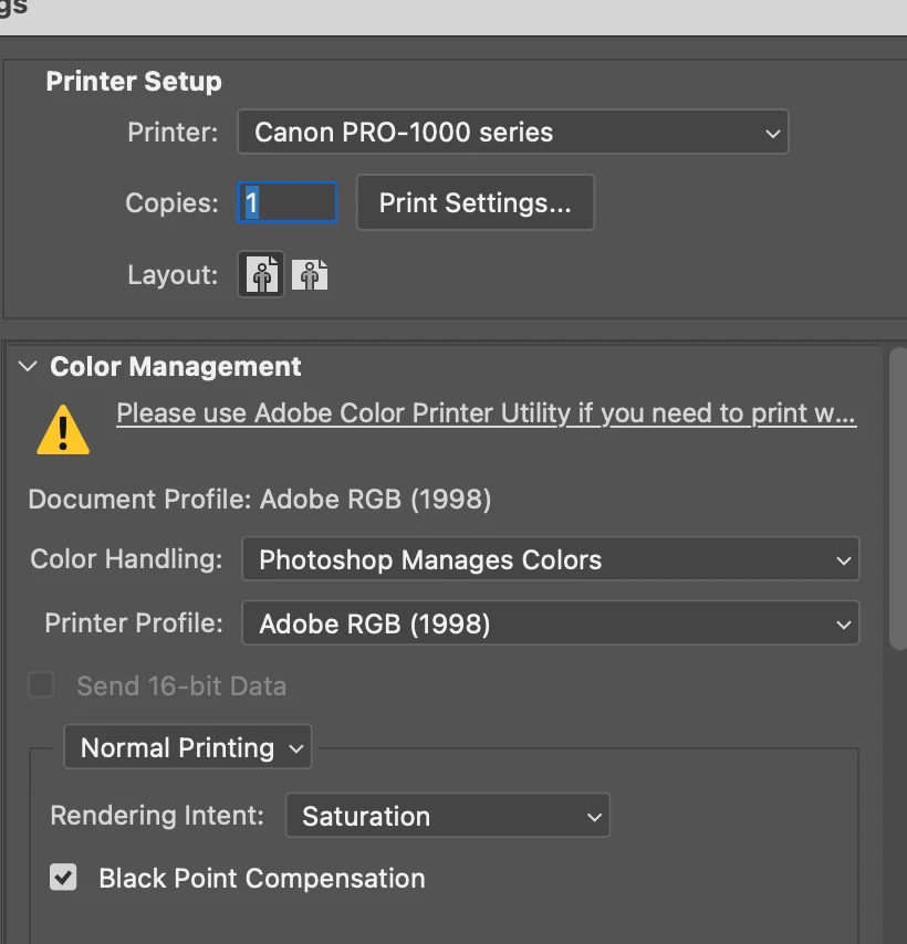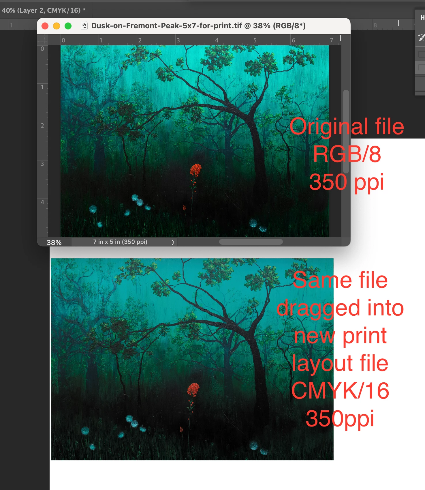 When I drag it into a print layout file (for printing multiples on one sheet). The color is flat and the depth disappears. The print layout file is CMYK color, 16 bits per channel and 350 ppi.