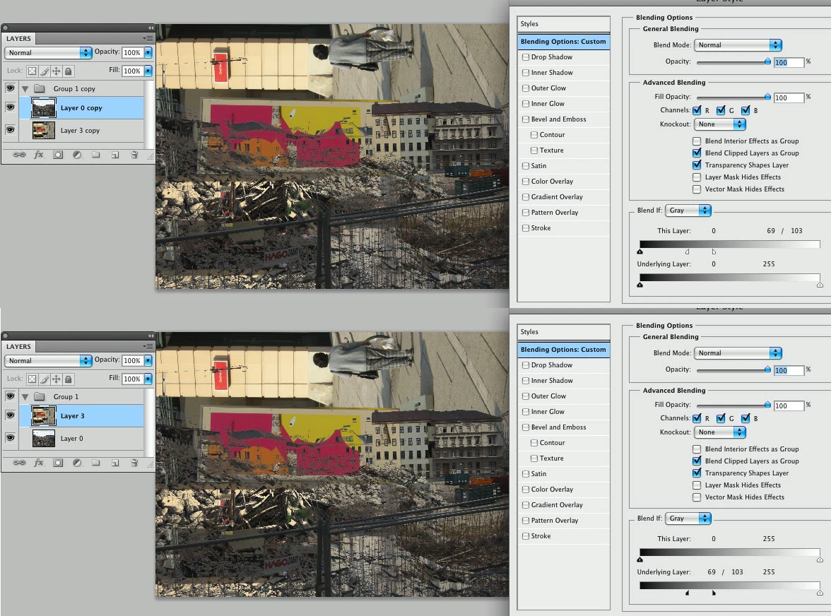 What I’m after (and mainly for the challenge, not because I have an actual need for it at the moment) is getting the the same effect as the applied Blend If-settings through masks on a non-blend-if-layer (and I’m aware that they are then no longer »live« so to speak).