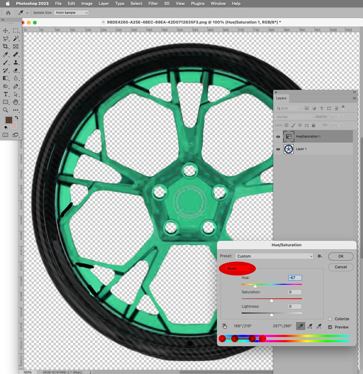 etc… Im looking for this to have the ability to change the color(s) of the face, or spokes if you will, of a 2 piece forged car wheel. The feature would have to identify the whole object, just as a remove background feature can dissect a background and leave the object in the image intact. Any suggestions are appreciated. I’ve attached an image of one of my wheels for an example. The blue part is a separate piece from the ‘barrel’ of the wheel. I’d like to change this color. But not to where it would look like I changed it using an app like windows paint. Looks totally fake that way. Thanks