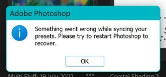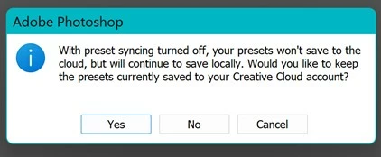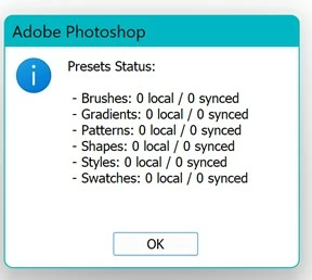 Photoshop will launch as if it has been installed newly. Enable the Preset Sync and wait for it to finish.