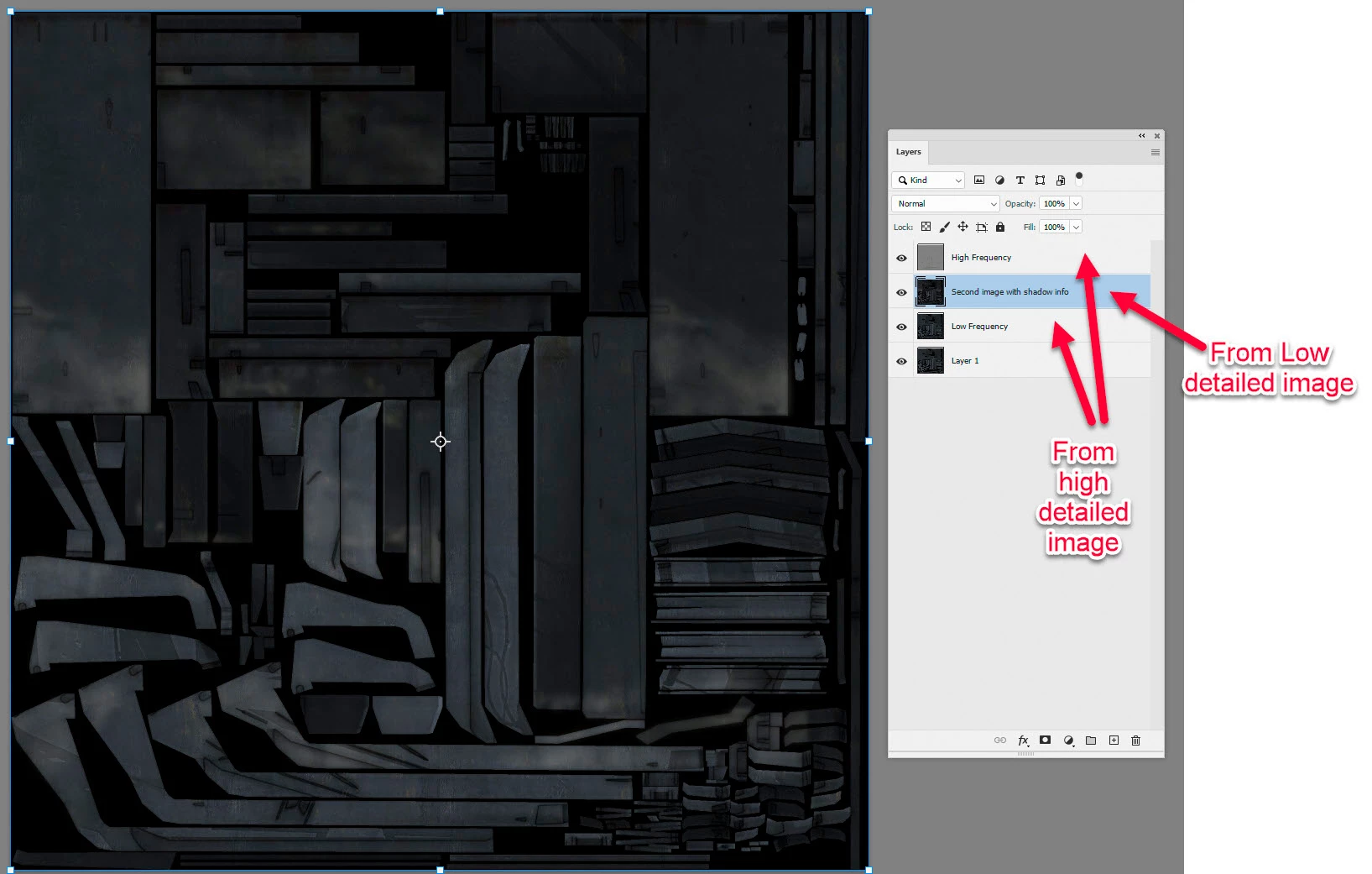 1. Start out with the high detailed version (your 2048 x 2048 pixel image) and make two copies of the image layer. Name the first (lower copy) 'Low Frequency' and the second (upper copy) 'High Frequency'