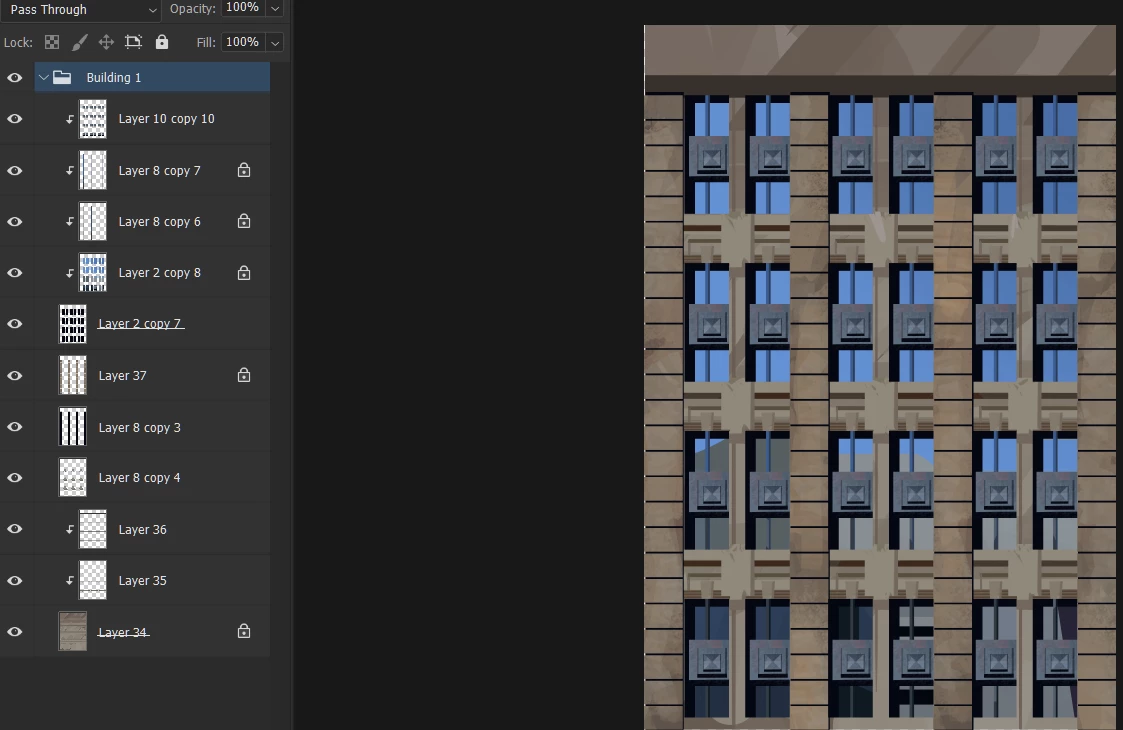 I am doing a digital painting of a city where each facade/face is painted flat, and then converted into a smart object and warped in my illustration.
