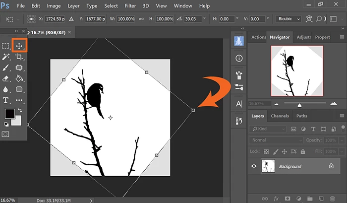 Go to Edit > Transform > Rotate. With the Move tool selected, click & drag handles to rotate image. When done, hit Enter. See screenshot.