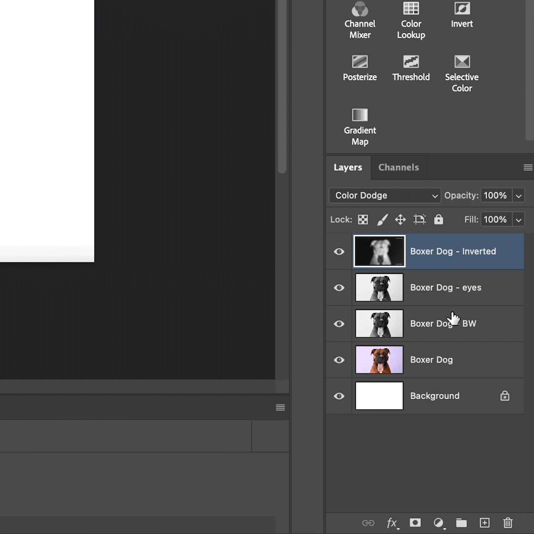 2. Invert Your Second Layer: Duplicate the desaturated layer. Then invert it using Command + I (or Control + I on Windows). Change the blend mode of the inverted layer to Color Dodge. |