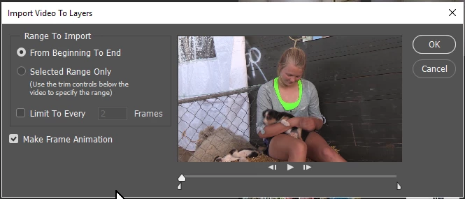 The problem is that GIFs are not very efficient, and anything more that a few seconds, will produce unwieldy files that take a long time to load and won't play well. I'd be inclined to open the video in Photoshop, and cut the clip down to just the bit you want. by positioning the Playhead, and clicking on the Scissors icon. Do this at the beginning and end of the desired footage, and delete the bits you don't want.