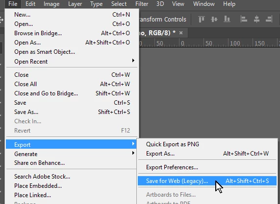 File > Export > Save for web (Legacy)