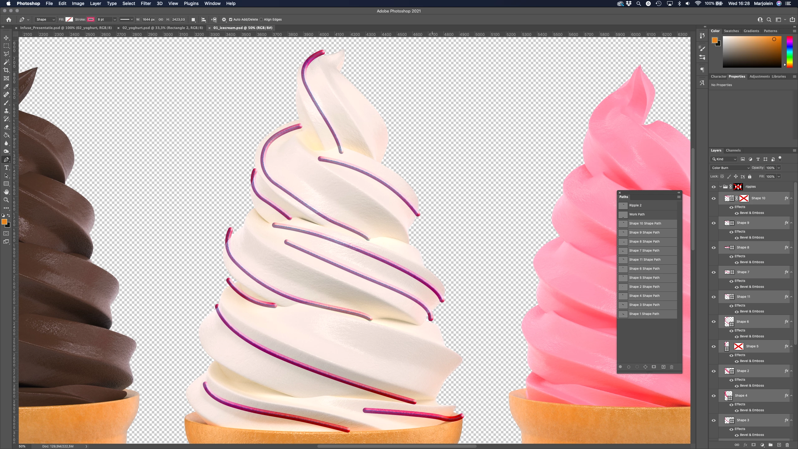 I drew a few strokes, gave them a width, a color and a layer effect. Now I need the strokes to be tapered instead of what it looks like now. See below for the images.