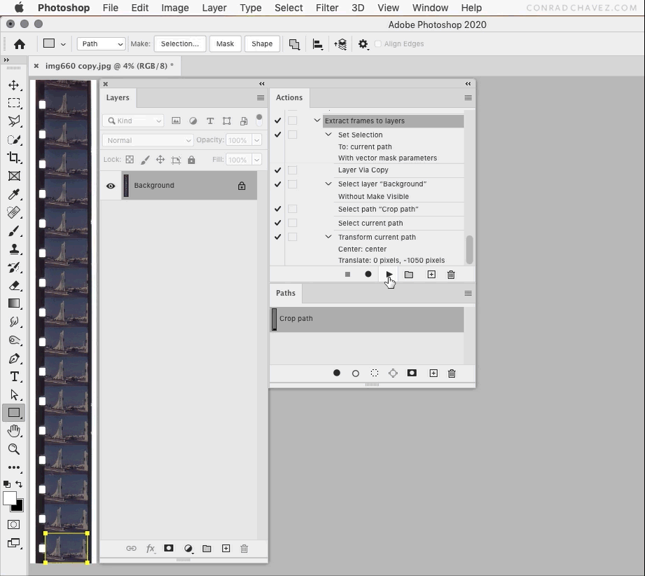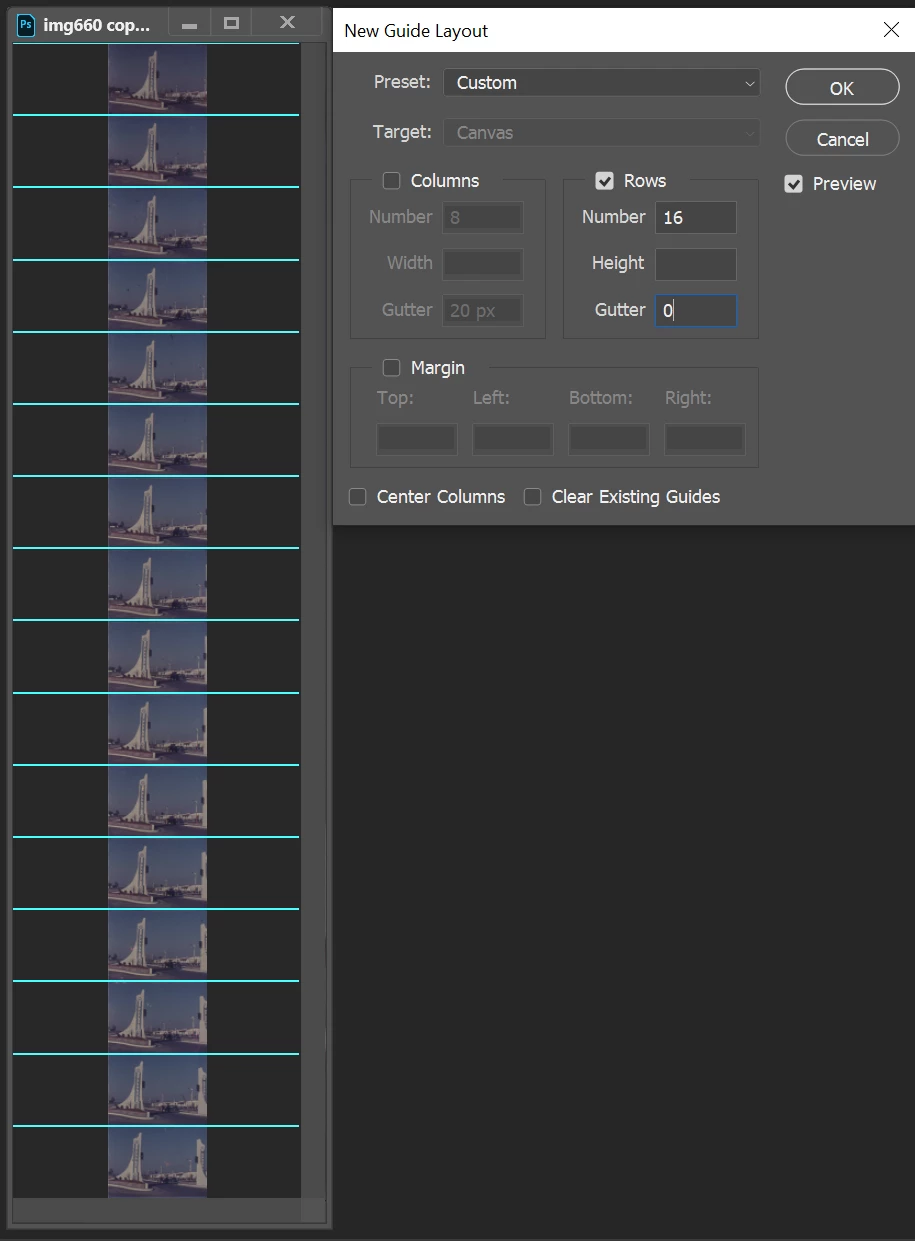 My goal: to give photoshop raw scan files of 35mm film strips and have photoshop divide, separate and save the photos in to individual files. I always scan at 5 columns by 2 rows.