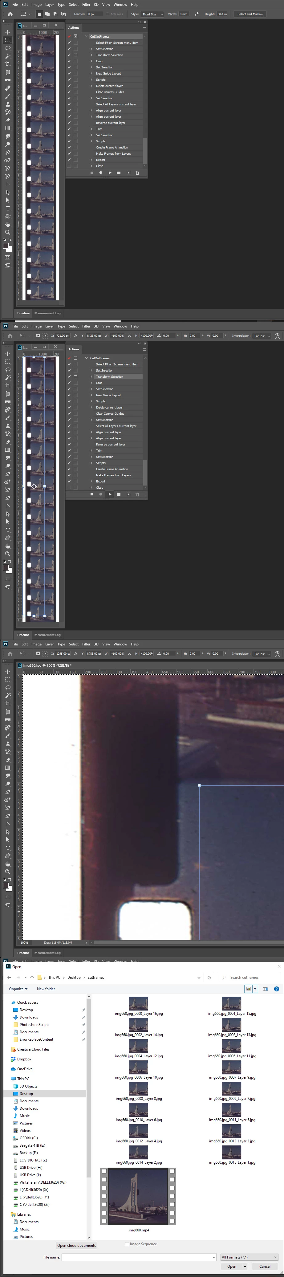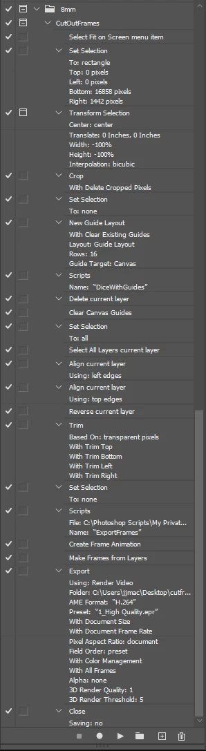 Did you ever figure out how to record an action to extract your supper 8mm film scans. The results are not the best but it hard to know for sure.  The scan quality was poor and there was some camera movement so hard to tell if the selection  I set was the correct height for 16 8mm frames.  If the height is wrong the 16 cut frames would not have the correct frame height which is critical. The width  being off would just be like cropping the frame sides.  The wrong height would cause image drift.  The Action cropped the film strip diced the stripe into frame layers and exported the layers as files. Create a frame animation and renders an MP4.  I did have to make the Export layers to files step a script step. Export Layers to Files is a plug-in so it can be recorded in an action however, the file prefix would also be the same when played not reflect the current strip's file name.  I did not want two interactive steps in the action so the script set the file prefix to the current strip's name.  I also found a had to zoom to actual pixels to be able to position the transform selection  well. You cab see the in the screen capture.
