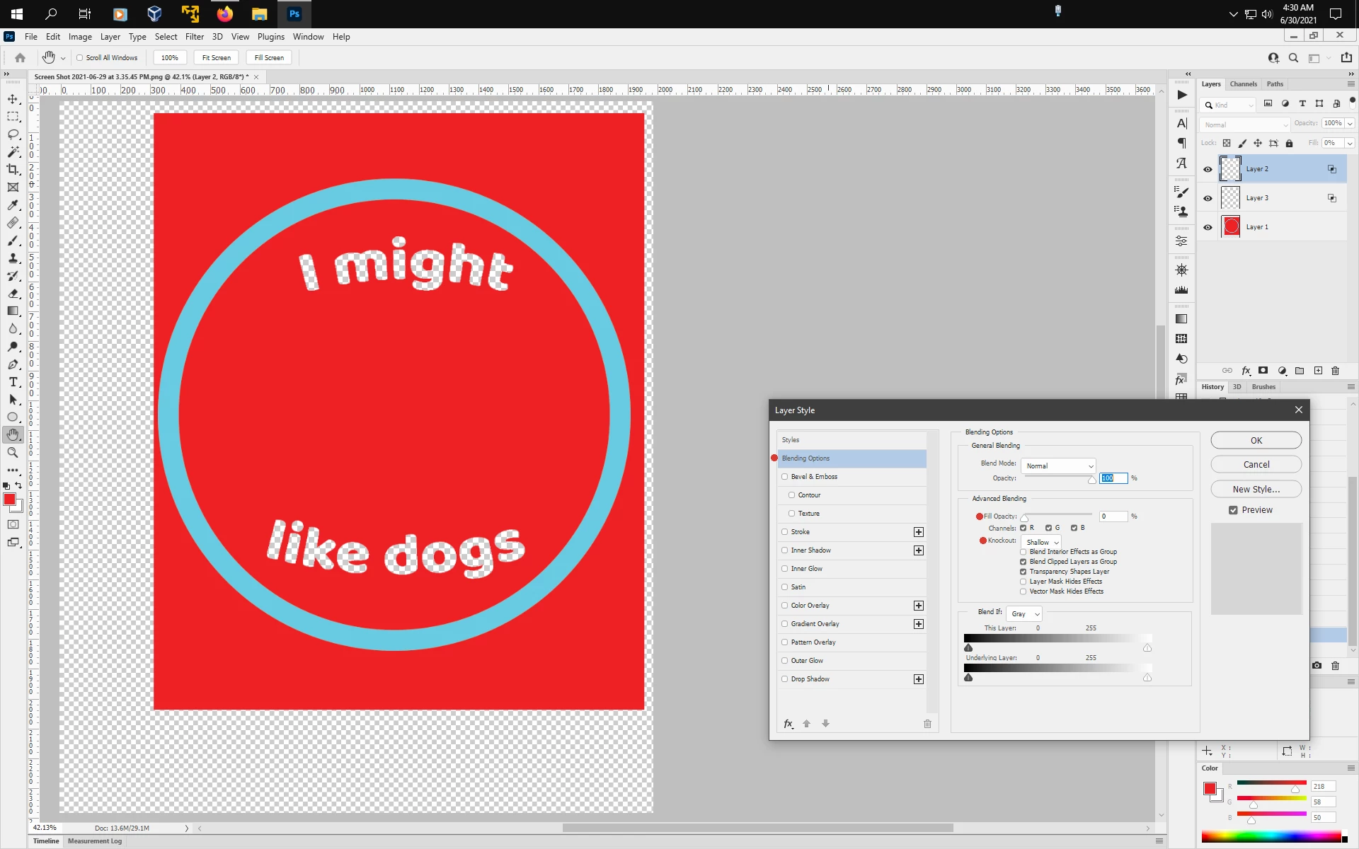 I want to remove the "I Might" and the "like dogs" from the red layer so that they are holes, as it were. Not white text (rasterized) but just an empty hole in the red layer.