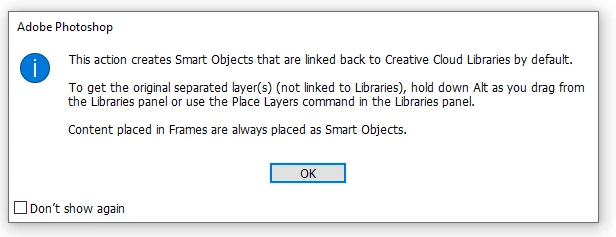 After the latest "update" to photoshop, whenever I drag an item from the library to a document I'm working on a popup comes up saying it is now a "linked" file and if I want to place it as a copy, I have to hold the ALT key down while dragging it from the library.