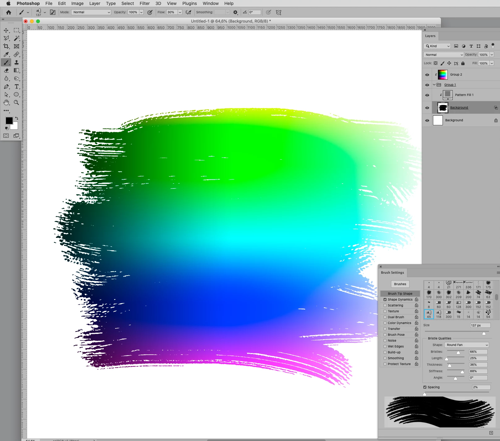 I am sure you get the idea. Angle jitter keeps changing the brush shape and scatter moves it about giving you the ragged outline.