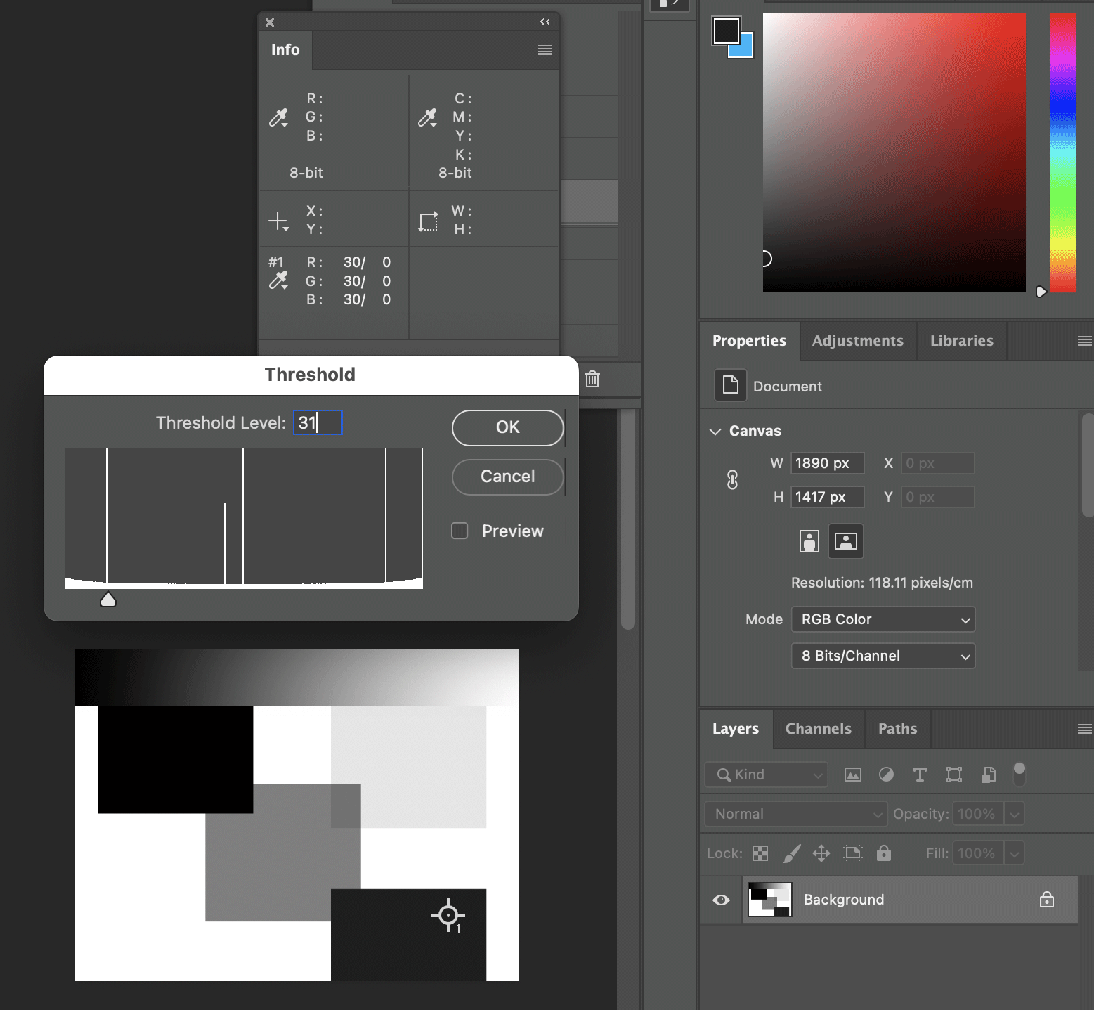Another option is to use Image > Adjustments > Threshold and type in a value of 31 to help visually isolate a value of 30r30g30b.