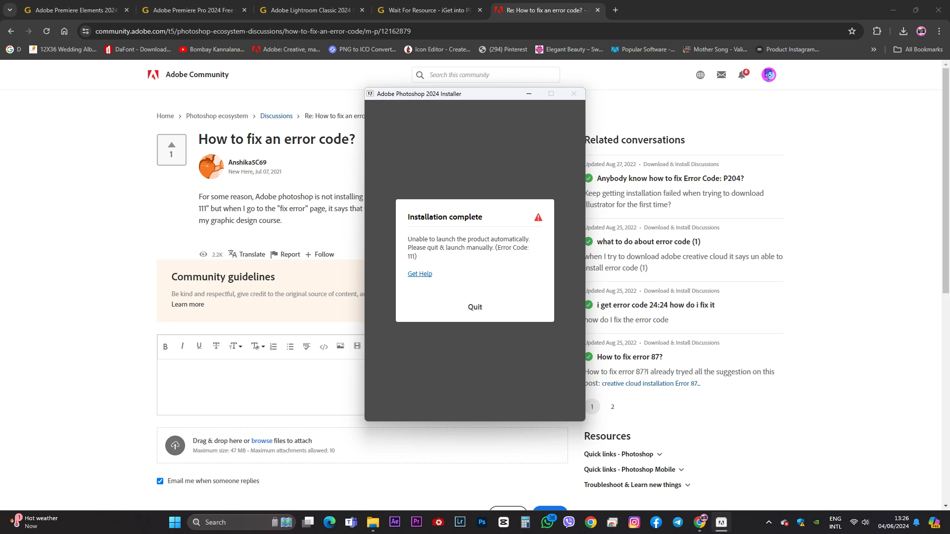 For some reason, Adobe photoshop is not installing on my device. It says that there is an error and the error is "error 111" but when I go to the "fix error" page, it says that there is no such error code as "111". I urgently need this app for my graphic design course.